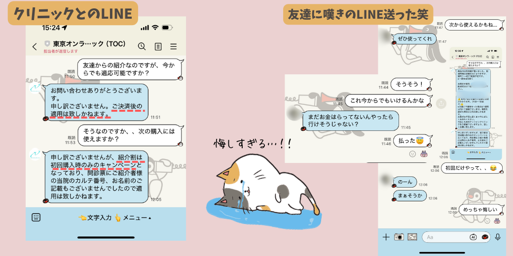 クリニックに問い合わせましたが、決済後は適応できないとのことで友達に嘆きまくってました