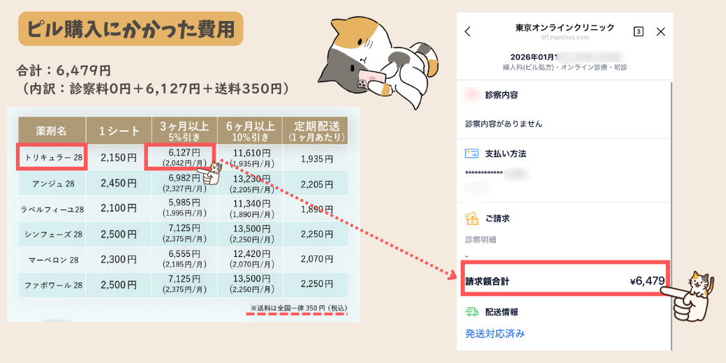 診察料+お薬代(3ヶ月分)+送料の合計で6,479円でした