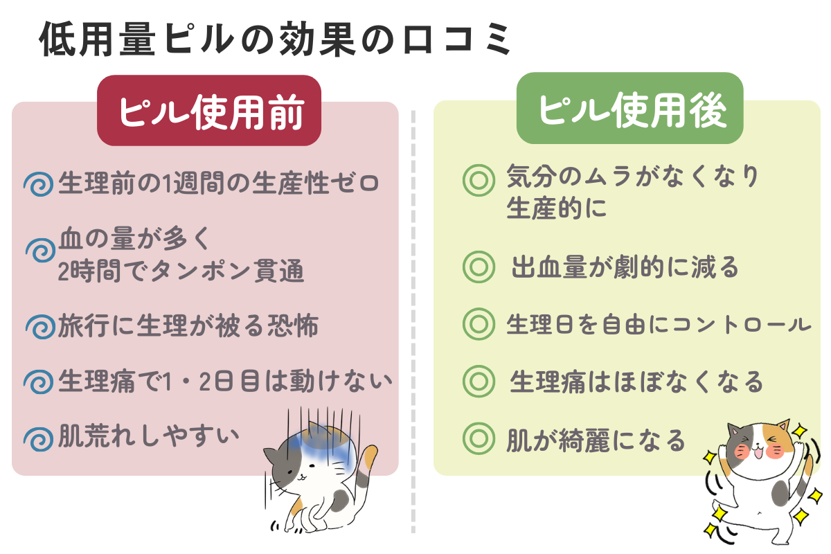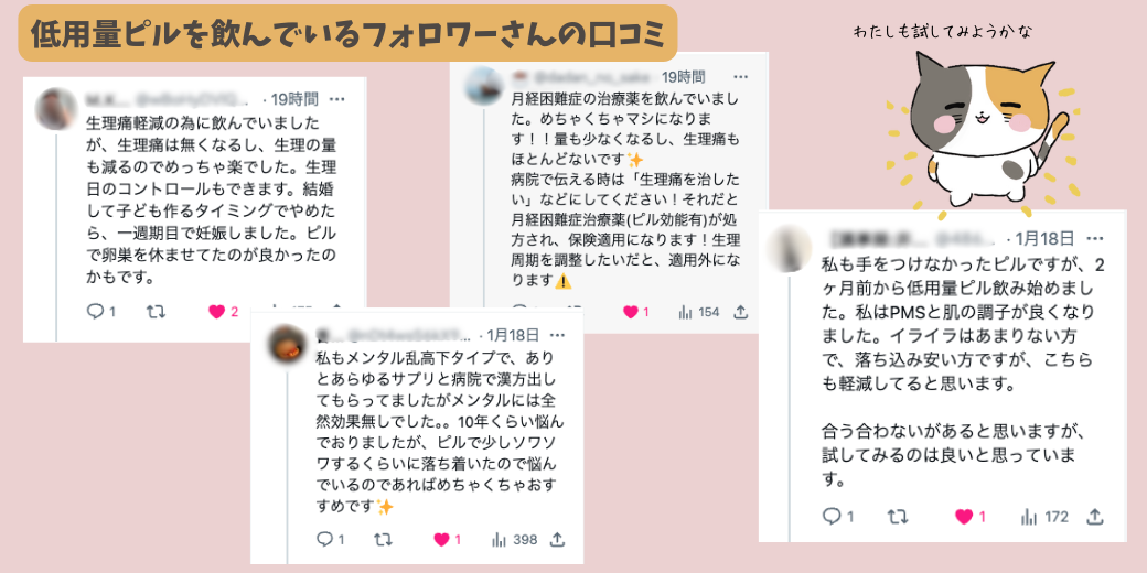 フォロワーさんの頂いたリプから、ピルの効果をまとめると